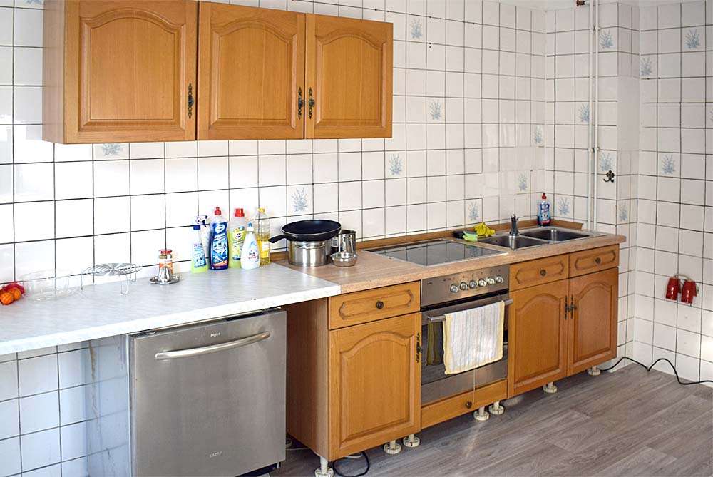 Küchenausstattung: Einbauküchen mit Geschirrspüler, Herd, Backofen, Mikrowelle, Kaffeemaschine, Wasserkocher, Toaster, Geschirr, Gläser, Töpfe, Pfannen , Besteck etc.
